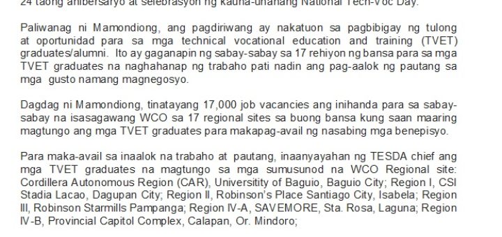 Jobs Fair ikakasa sa National Tech-Voc Day at 24th anibersaryo ng TESDA