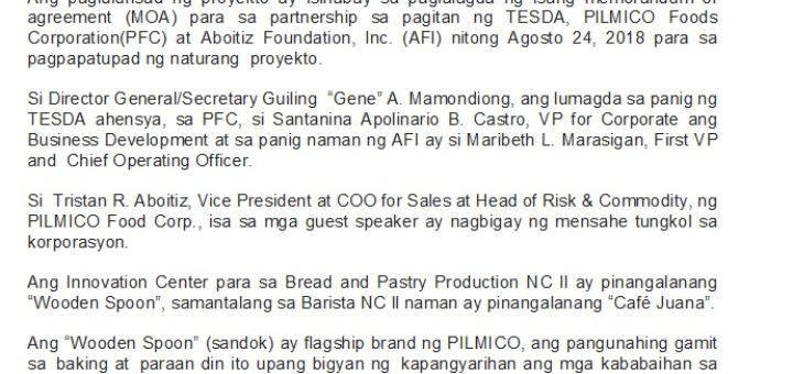 News Release Public Information Unit TESDA August 24, 2018 Business Innovation Center para sa Baking and Pastry Production at Barista inilunsad Pormal nang inilunsad ng Technical Education and Skills Development Authority (TESDA)...