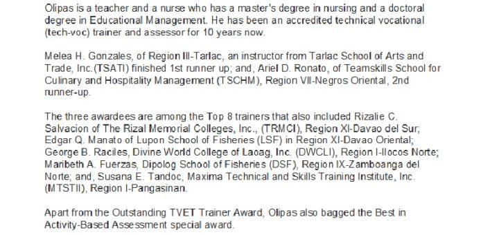NEWS RELEASE Public Information Unit TESDA 14 October 2018 TESDA names Outstanding TVET Trainer for 2018 A licensed teacher and nurse has been chosen “Outstanding TVET Trainer” at the recently concluded 2018...