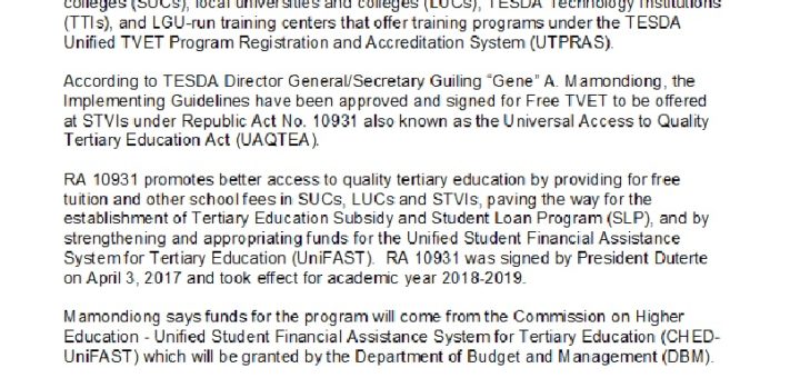 NEWS RELEASE Public Information Unit TESDA 07 October 2018 TESDA TVET programs now offered for free The technical vocational education and training (TVET) programs of the Technical Education and Skills Development Authority (TESDA)...