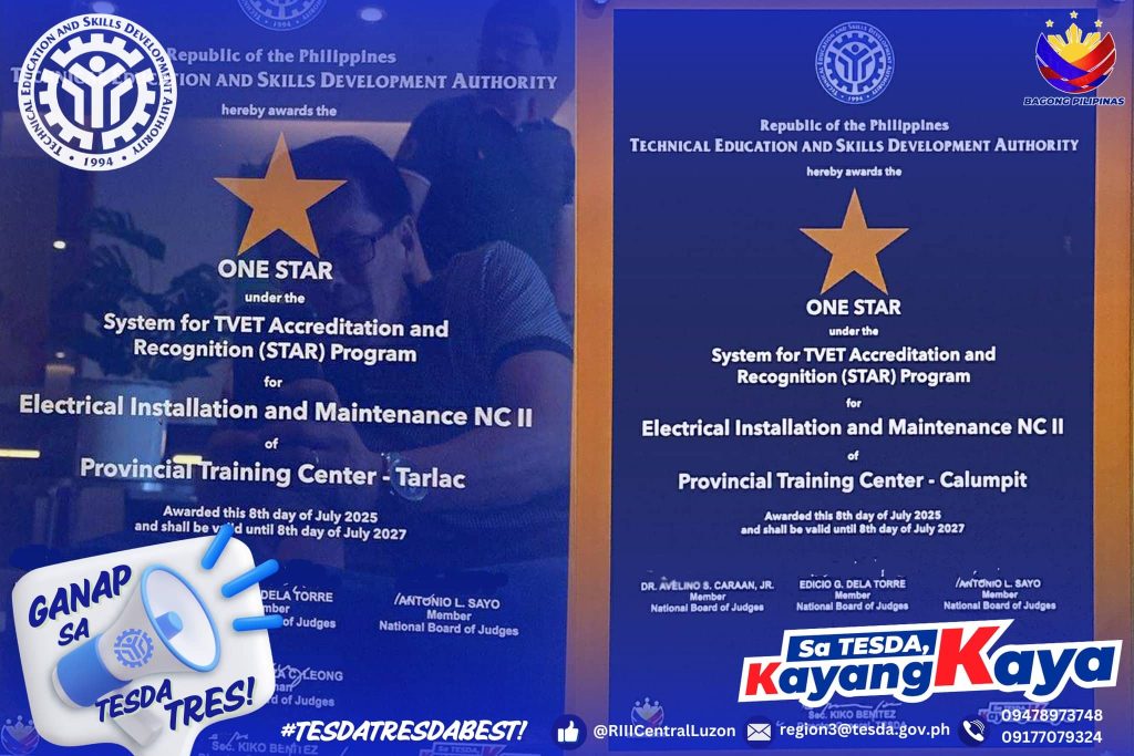 We extend our warmest congratulations to PTC-Calumpit and PTC-Tarlac for successfully attaining 1-STAR (EIM NC II) for System for TVET Accreditation and Recognition (STAR), this is a system that recognizes TVET (Technical Vocational Education and Training) programs that surpass the minimum requirements for program registration with TESDA. It aims to identify and acknowledge institutions and programs that demonstrate high-quality standards in TVET delivery.