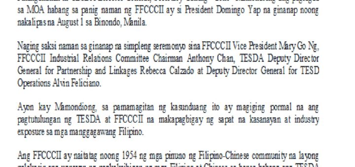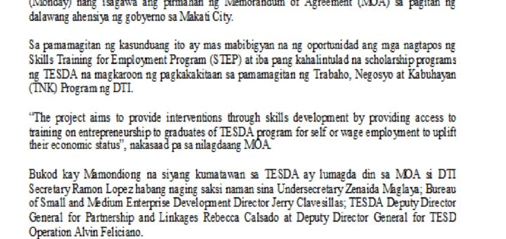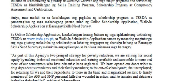 PRESS RELEASE August 13, 2017 From: Technical Education and Skills Development Authority (TESDA) Ref: Public Information Unit (PIU) Tel. No. 8323781 TESDA NAKIBAHAGI SA SERBISYO CARAVAN Nakibahagi ang Technical Education and Skills Development...