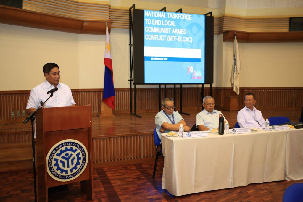 Technical Education and Skills Development Authority (TESDA) Director General, Secretary Isidro S. Lapeña, pledged the full support and cooperation of the agency in preventing and addressing local communist armed conflict in the country, in accordance with Executive Order No. 70 recently issued by President Rodrigo Roa Duterte.
