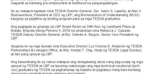 “TESDA’s role for this effort is crucial as we are the gateway of training, employment and the livelihood. Hindi tayo pwedeng makapagbigay ng employment at livelihood kung hindi sila mag-train for this purpose. That’s why TESDA is here,” ani Lapeña.