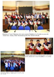 Eight Filipino competitors received the Medallion for Excellence award. They are Marc Dave Perez, Region lV-A, Restaurant Service; John Jay Abinal, Region V, Electrical Installations; Benedict Hornido, CARAGA, Graphic Design Technology; Heinrich Omlaan, Region Xl, Welding Technology; Anthony Cabigayan, Region lll, IT Software Solutions for Business; Joeminel U. Cutcharo, Region Vlll, Automobile Technology; Marvin Madla, Region lll, IT Network System Administration and Patrick Neil Noceja, National Capital Region (NCR), Web Design and Development.