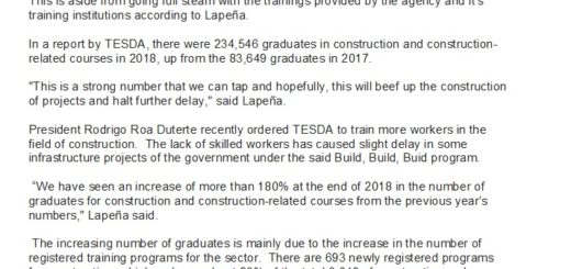 Meanwhile, Lapeña also clarified that TESDA committed to produce at least 2 million washable face masks per month and not 50 million as earlier reported. This will be part of the government project to initially produce 20 million face masks for distribution to the public. The project is being undertaken by the Office of the President with the Department of Health, Department of Trade and Industry, Department of Science and Technology, TESDA, and other agencies. The DTI, under Sec. Ramon Lopez, is overseeing the production of the washable face masks by the different manufacturers.  TESDA will contribute in this effort through “training cum production” of its scholars.